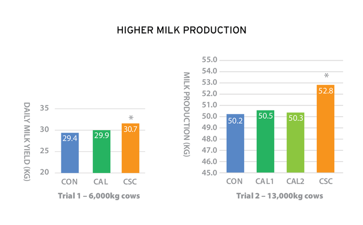 Our research demonstrates a big improvement in performance when cows are supplemented with Cow Start Complete (CSC), compared to cows supplemented with just calcium (CAL) or unsupplemented (CON) cows.